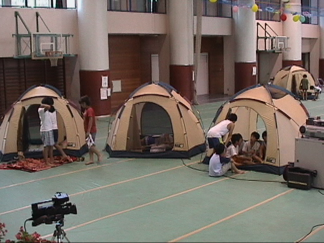 赤小学校協議会、地域防災連絡会の主催で実施される、地域の防災訓練です。今年は7月22日から23日に実施しました。 右の写真は、22日の夜に行われた、体育館でのテント宿泊、「避難所体験」です。 参加者は約50名、宿泊の他に「夜の学校探検」「映画会」など寝るのも忘れて楽しんでいました。