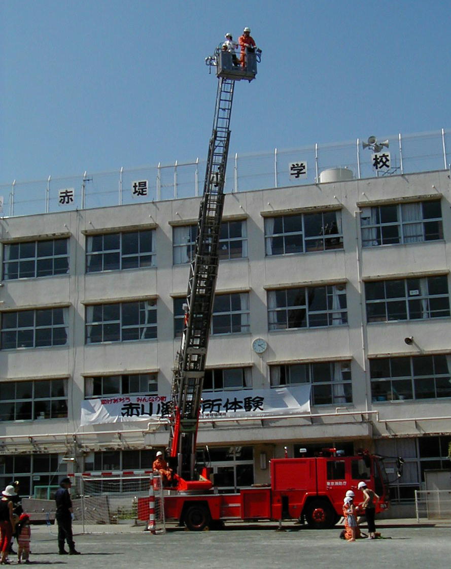世田谷消防署の協力を得て、写真のはしご車や、赤バイのインパルス(最新鋭の消火器具)の実演も行われました。